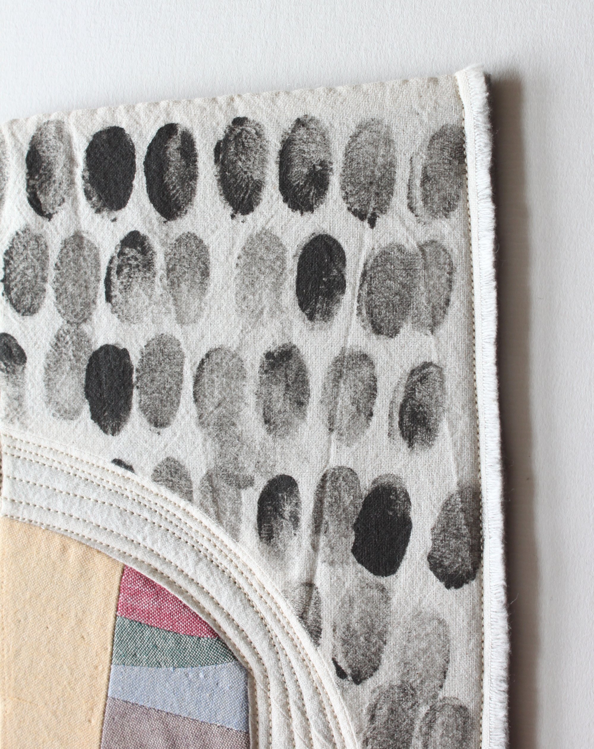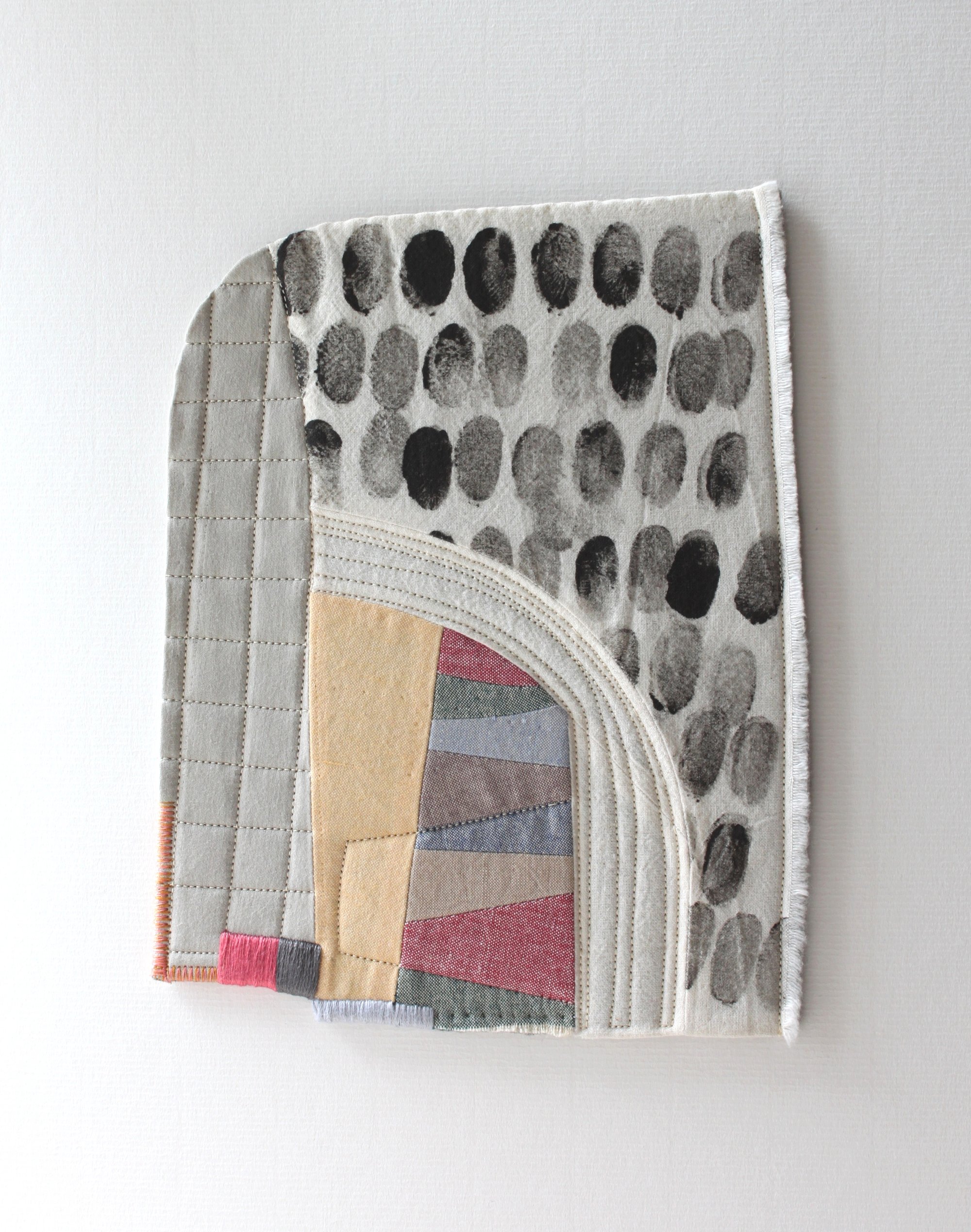 A unique and one off abstract patchwork textile composition made with a variety of fabrics, some with handprinted detail. The piece is machine and hand quilted with additional hand stitched details and backed with wool felt.